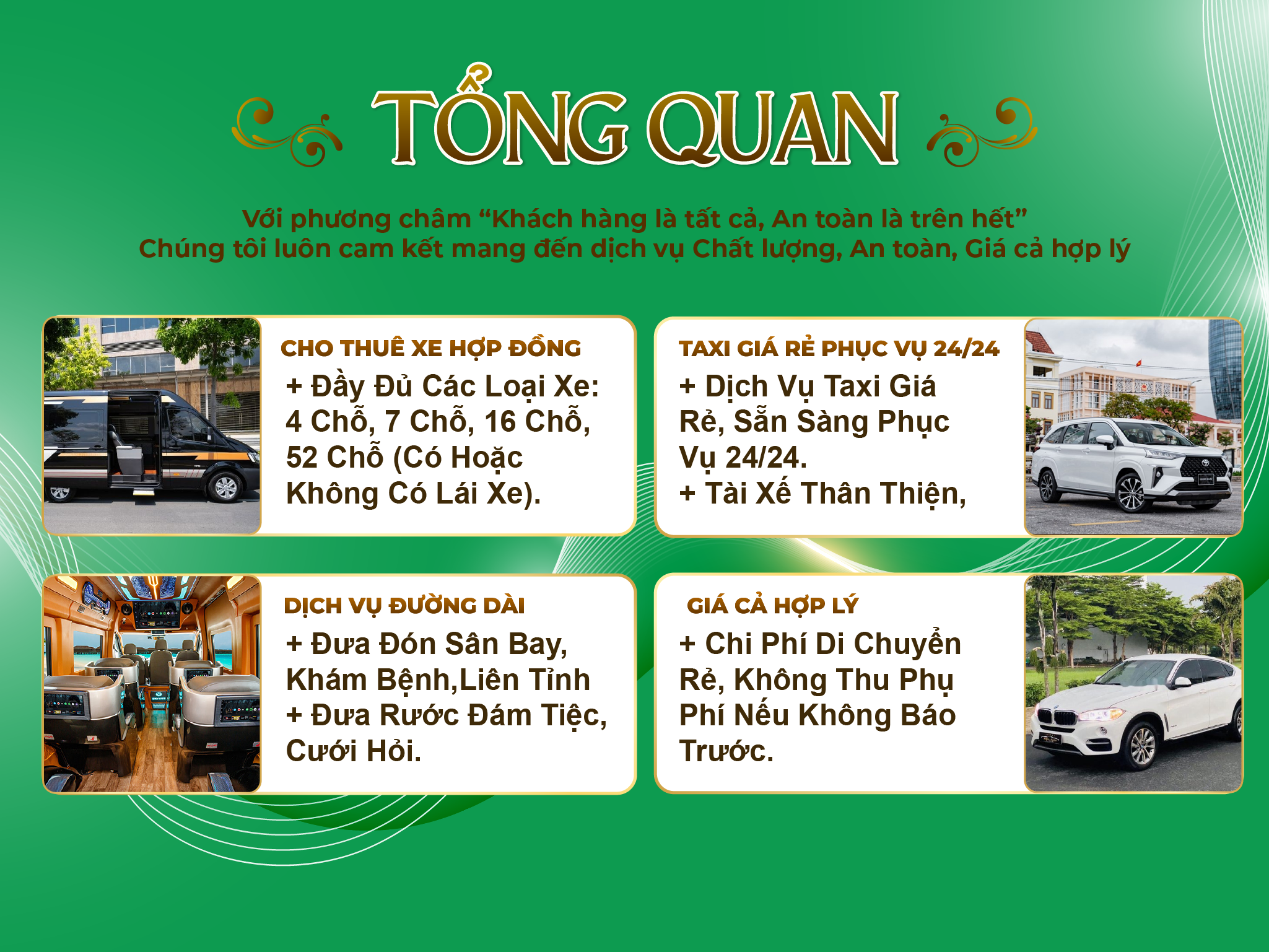 Số lượng xe đa dạng, 4 chỗ đến 45 chỗ, xe đời mới hiện đại, tiện nghi, sạch sẽ